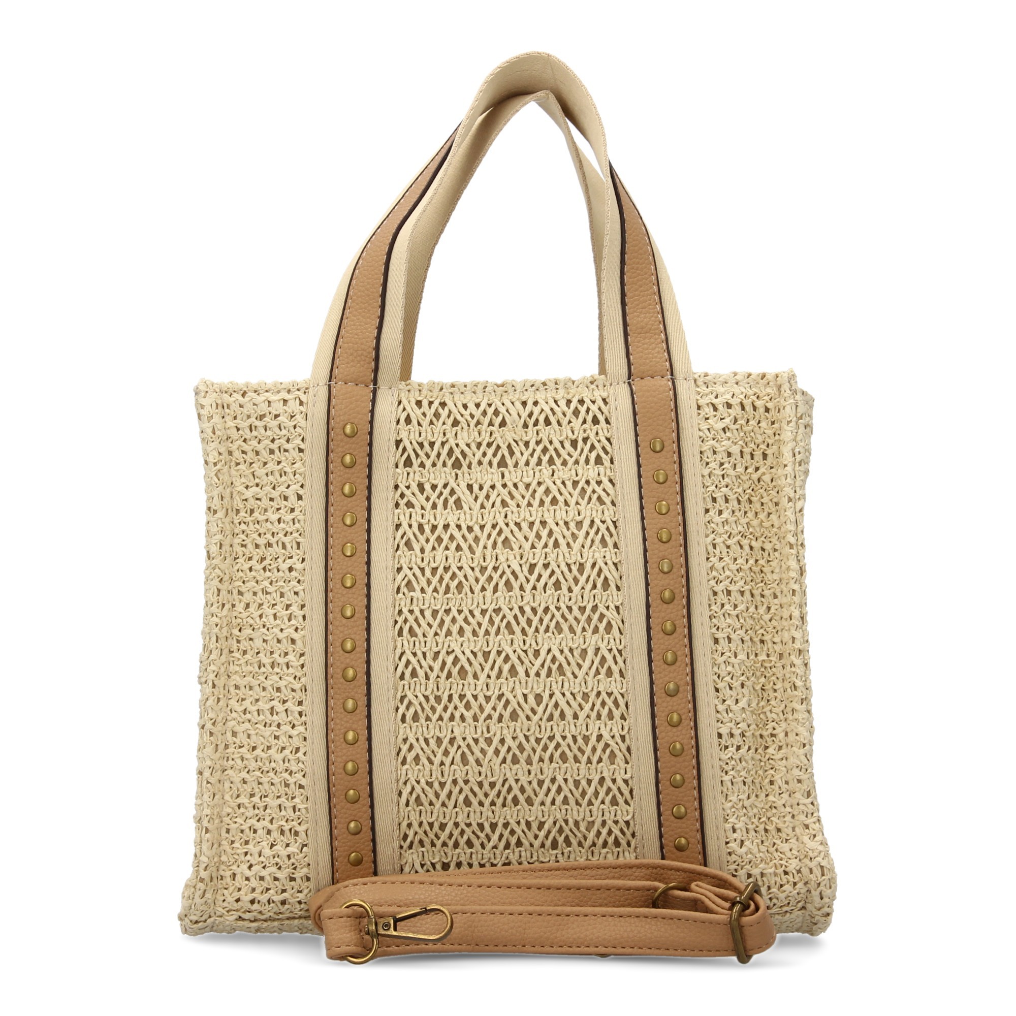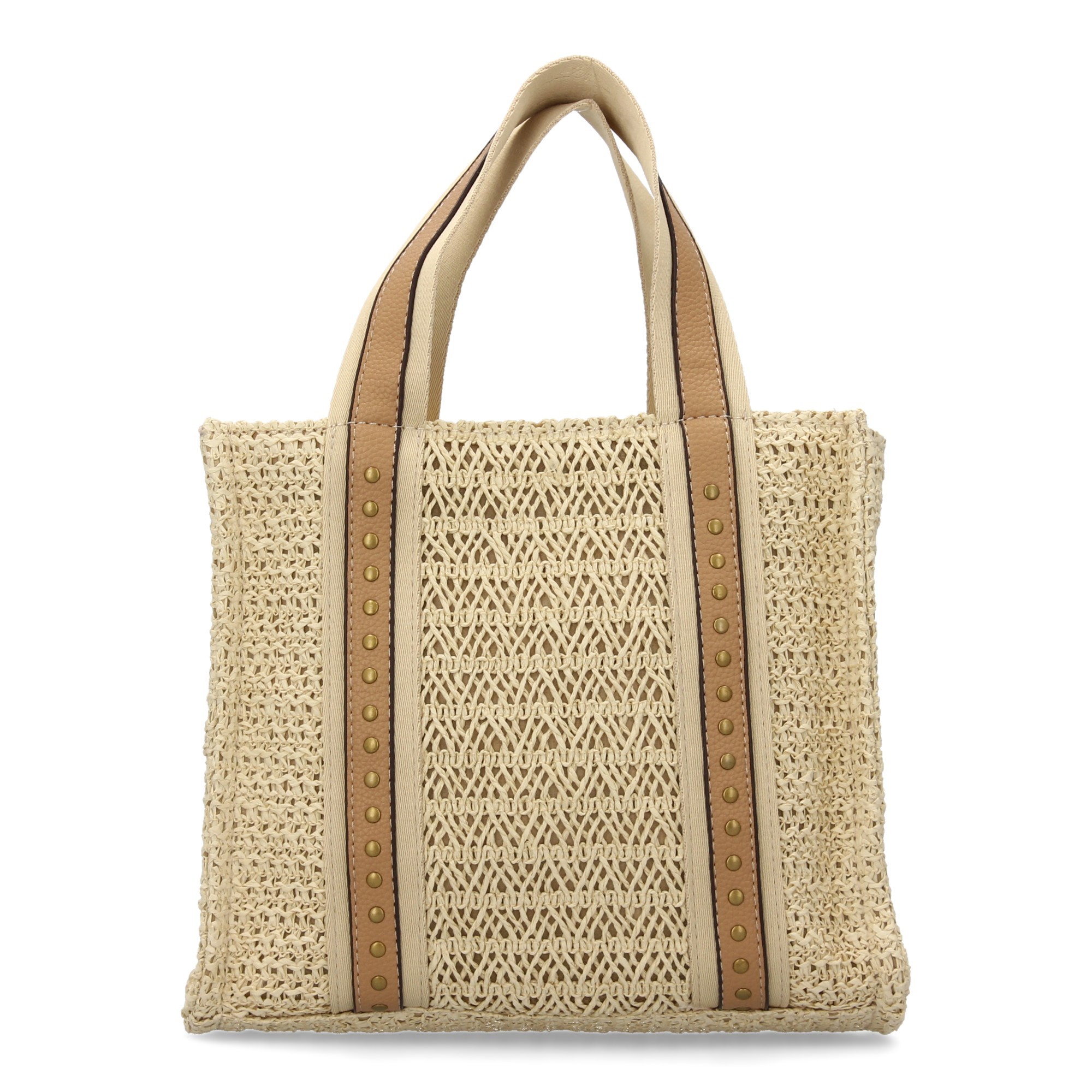 Bolso de hombro para mujer de rafia, diseño moderno con adornos metálicos, cómodo, en el interior compartimento principal de cremallera y tres bolsillos, uno con cremallera.