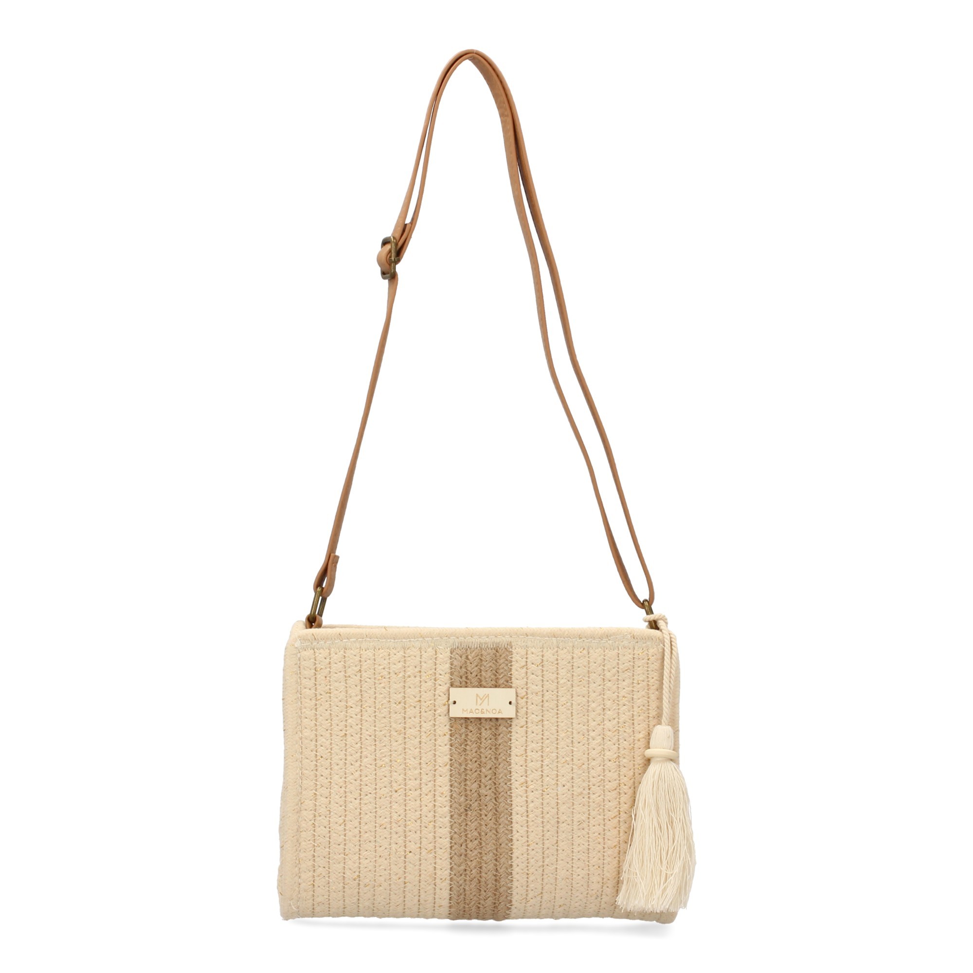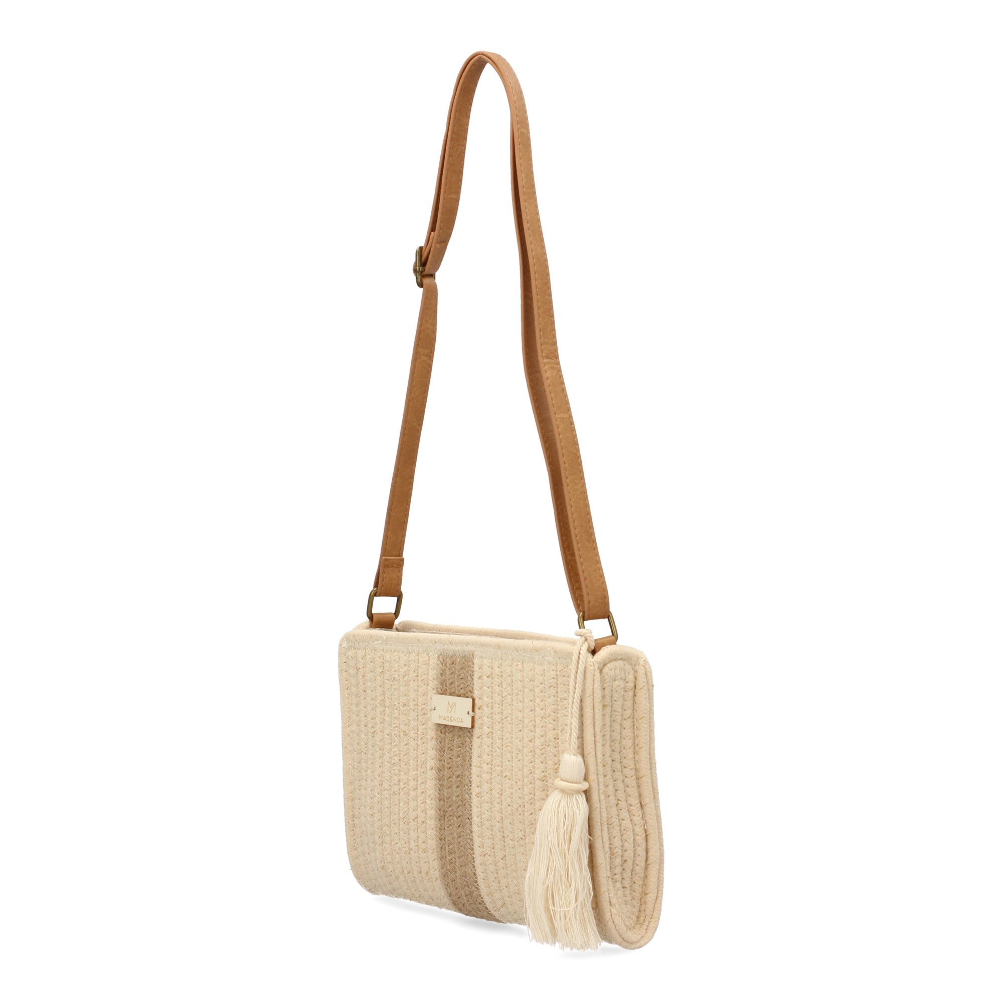 Bandolera para mujer, diseño moderno con flecos, interior con un compartimento principal de cremallera y un bolsillo.