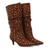 Bota de mujer de caña arrugada decorada con tachuelas metálicas brillantes tipo pedrería. Fruncido tacon fino punta fina. Ideal para temporada Otoño invierno.