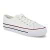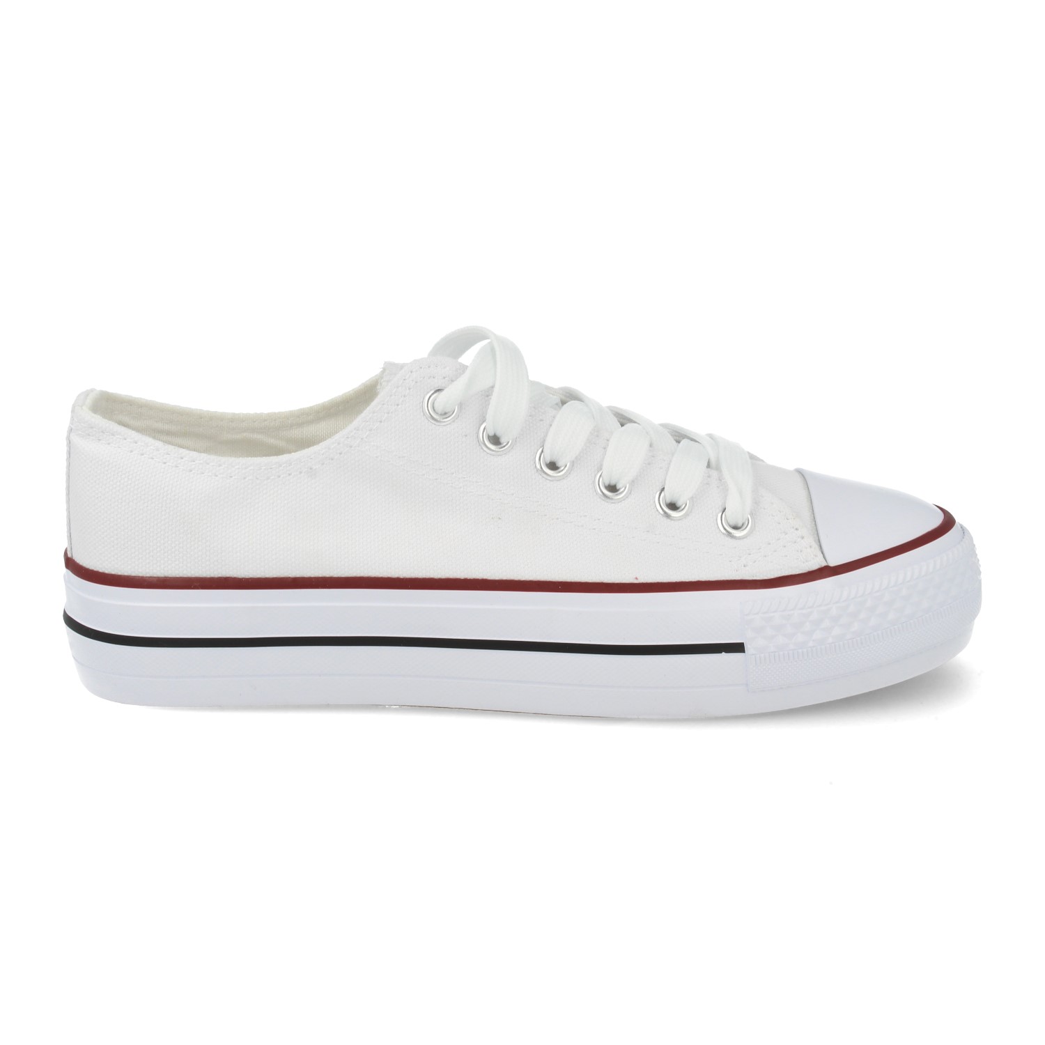 Zapatilla plana clásica de punta redonda con cordones. Ribete rojo en la suela.